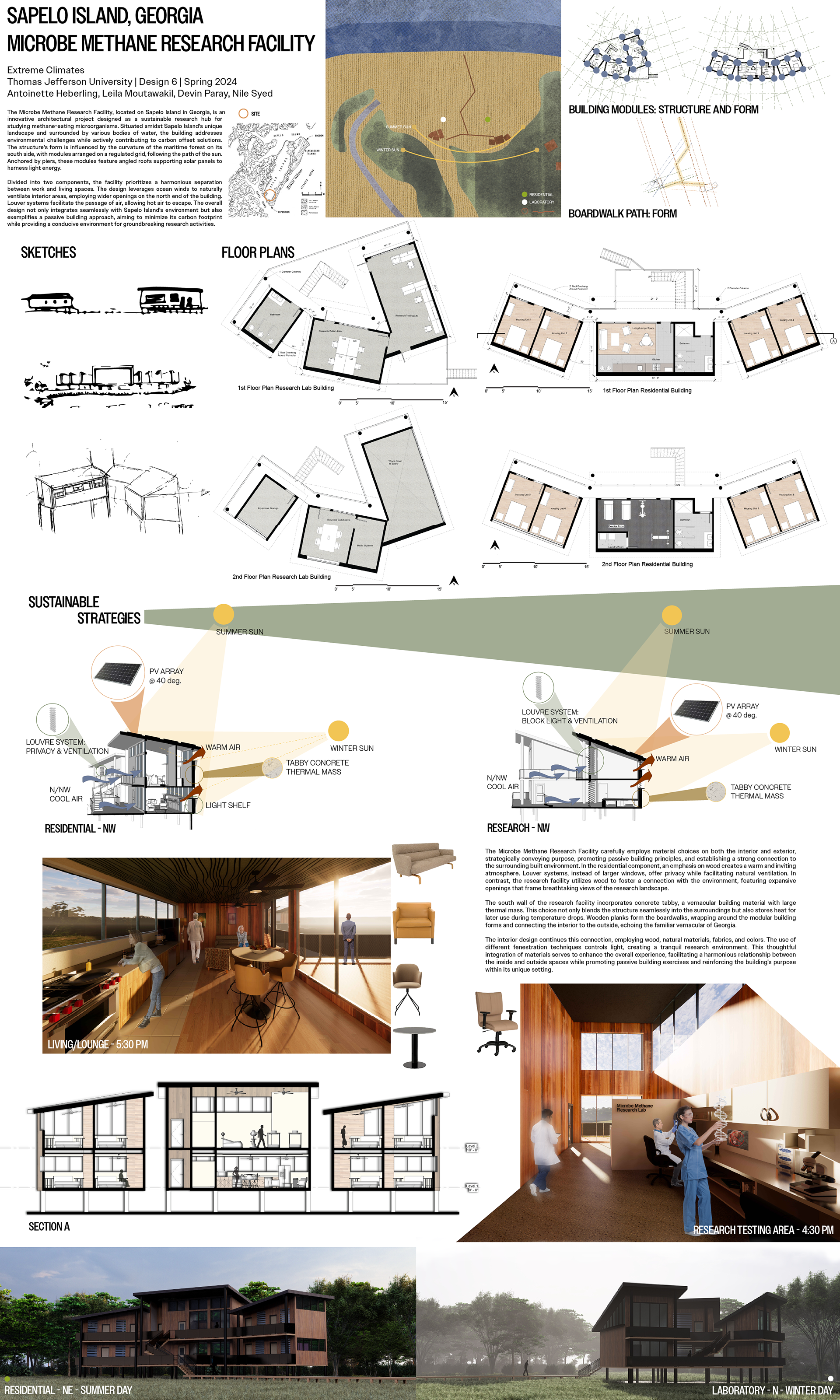 With the threat of Climate Change on the rise, a collaborative group of architecture and interior design students (3 arch, 1 int) set to tackle the extreme climate of water, with growing problems like the rise of flooding and sea levels. This three week project aims to research innovative and sustainable strategies to the problems while designing a residential unit and research lab for scientists to research mitigation strategies of this extreme climate
