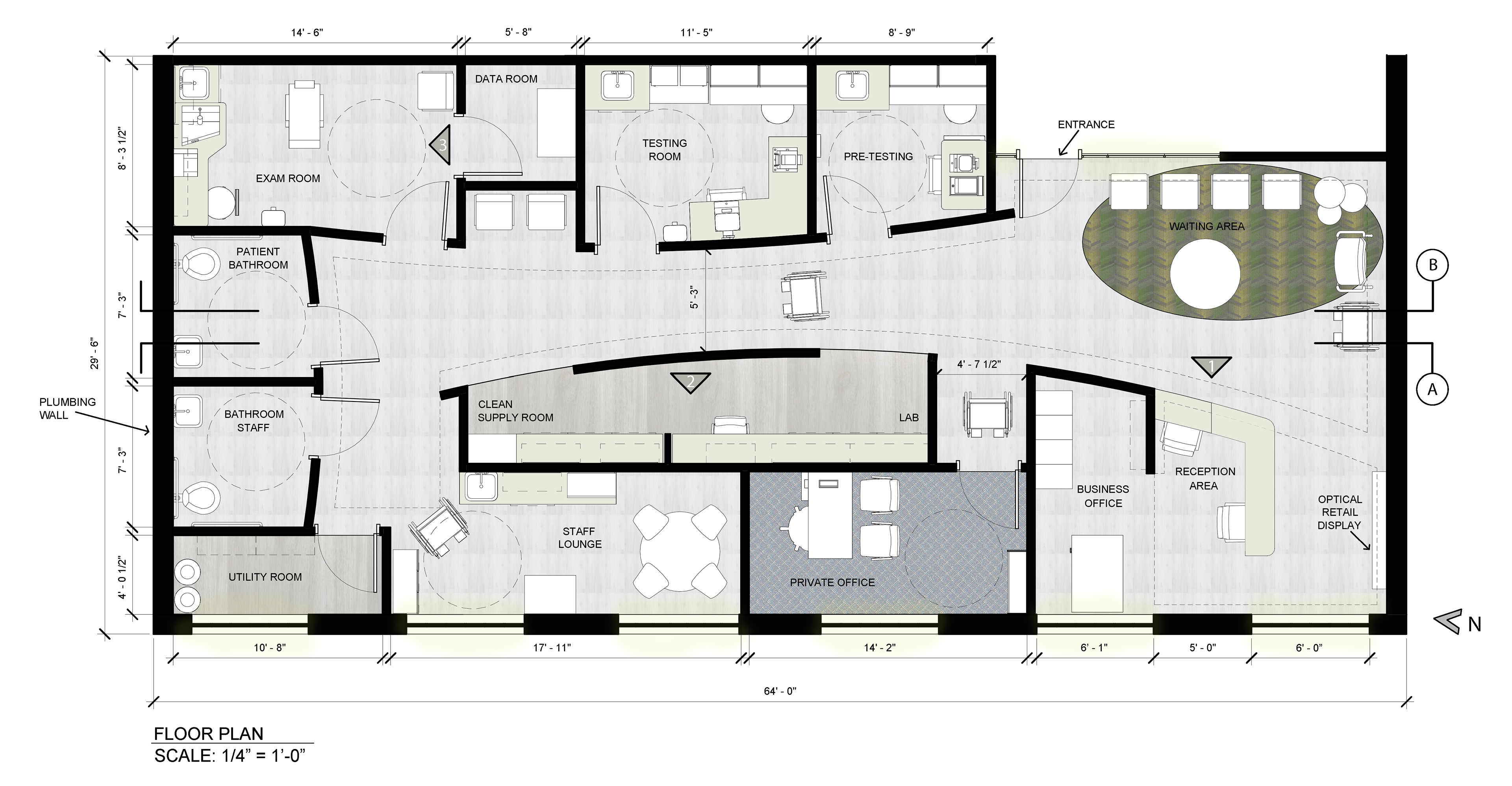 Two Physicians have partnered up to create a small medical office in a tenant space located in Philly. The space is on the second floor of 709-715 North 2nd Street, Philadelphia, PA. The space is approximately 1600 sqft with a façade of windows receiving west light. The office is an ophthalmology practice with exam and testing rooms and an optical retail display